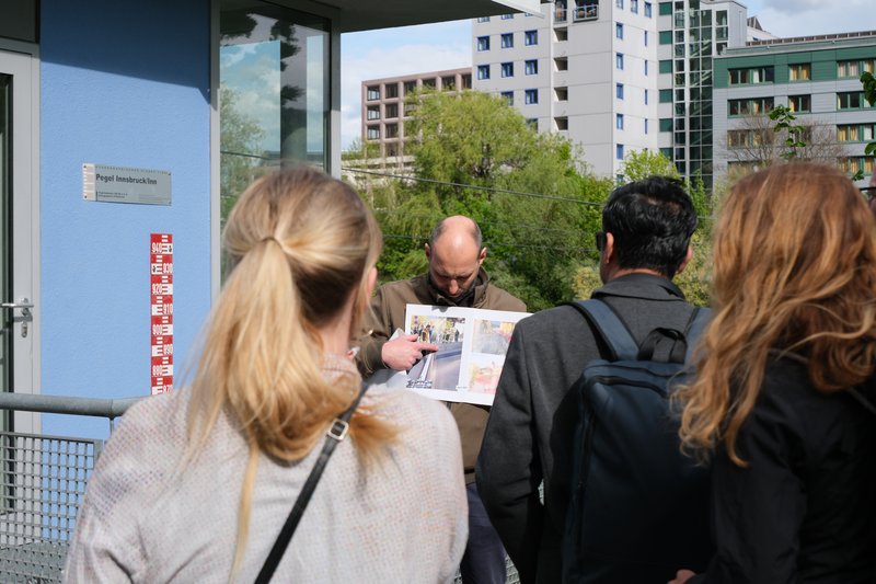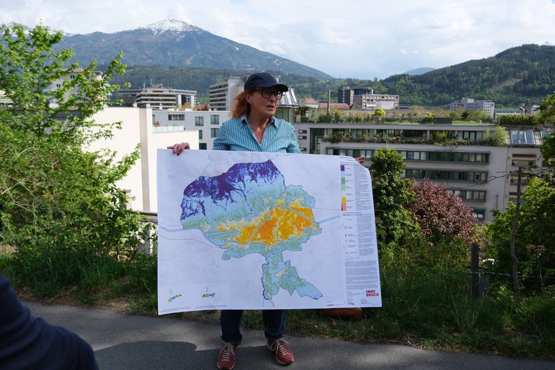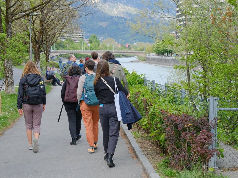 Climate Walks / Stadtspaziergänge / Exkursionen sind ein transdisziplinäres Format, um gemeinsam mit gesellschaftlichen Akteur:innen Lösungen für die Klimakrise zu erkunden. Ein Climate Walk schafft neue Perspektiven und lässt Herausforderungen (z.B. Hitzebelastung) und Best Practices (z.B. grün-blaue Infrastruktur oder Begegnungszonen) erleben. Ortskundige Inputgeber:innen vermittelten beim Climate Walk Innsbruck Hintergrund und Kontext.