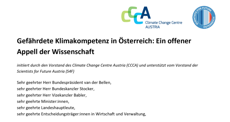 660 leading scientists in Austria are sounding the alarm: the board of the Climate Change Centre Austria (CCCA) has, with the support of the board of Scientists for Future Austria (S4F), published an open appeal. The appeal is directed at the Federal President, the Federal Government, ministers, state governors, and decision-makers in business and public administration.