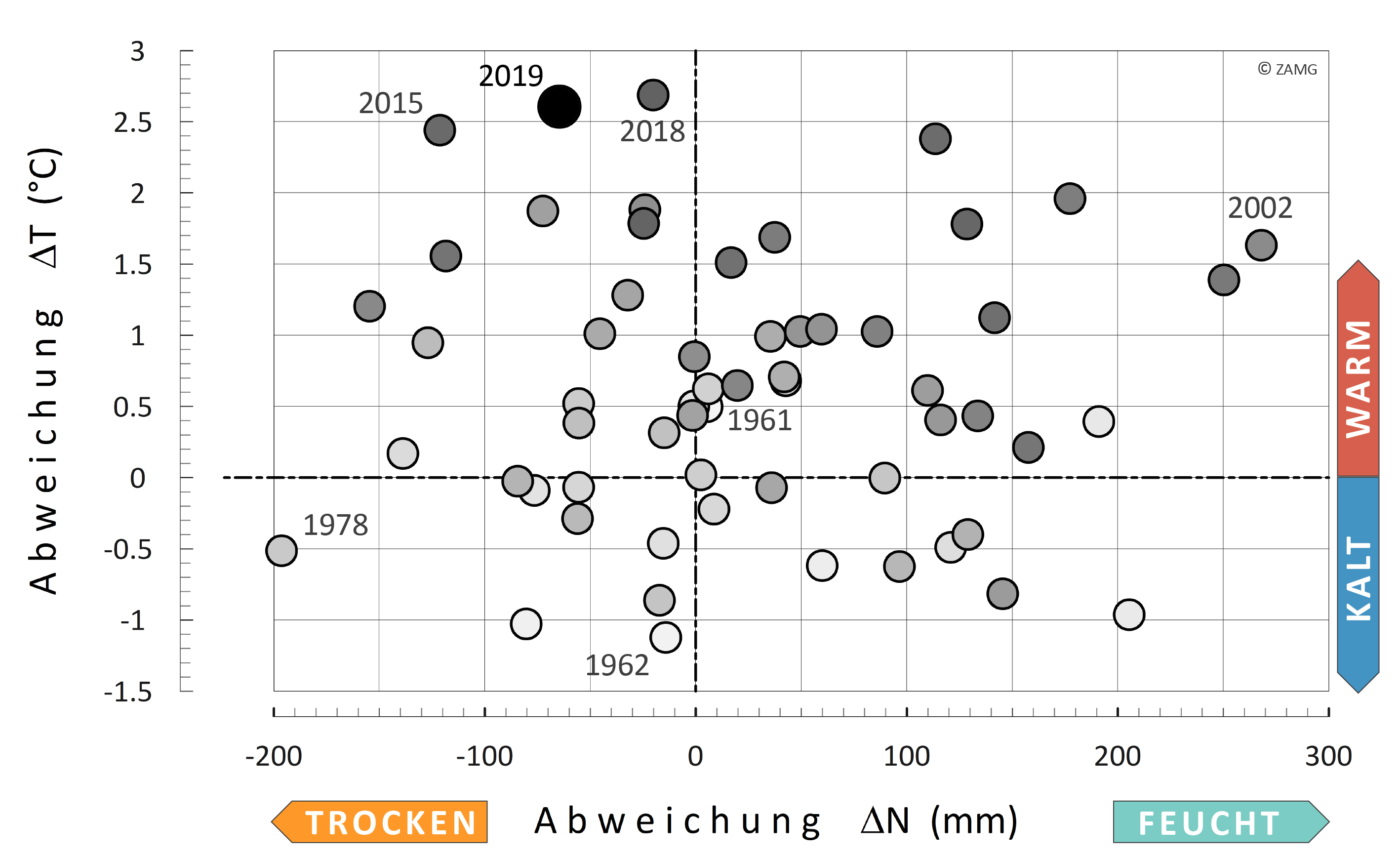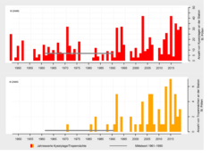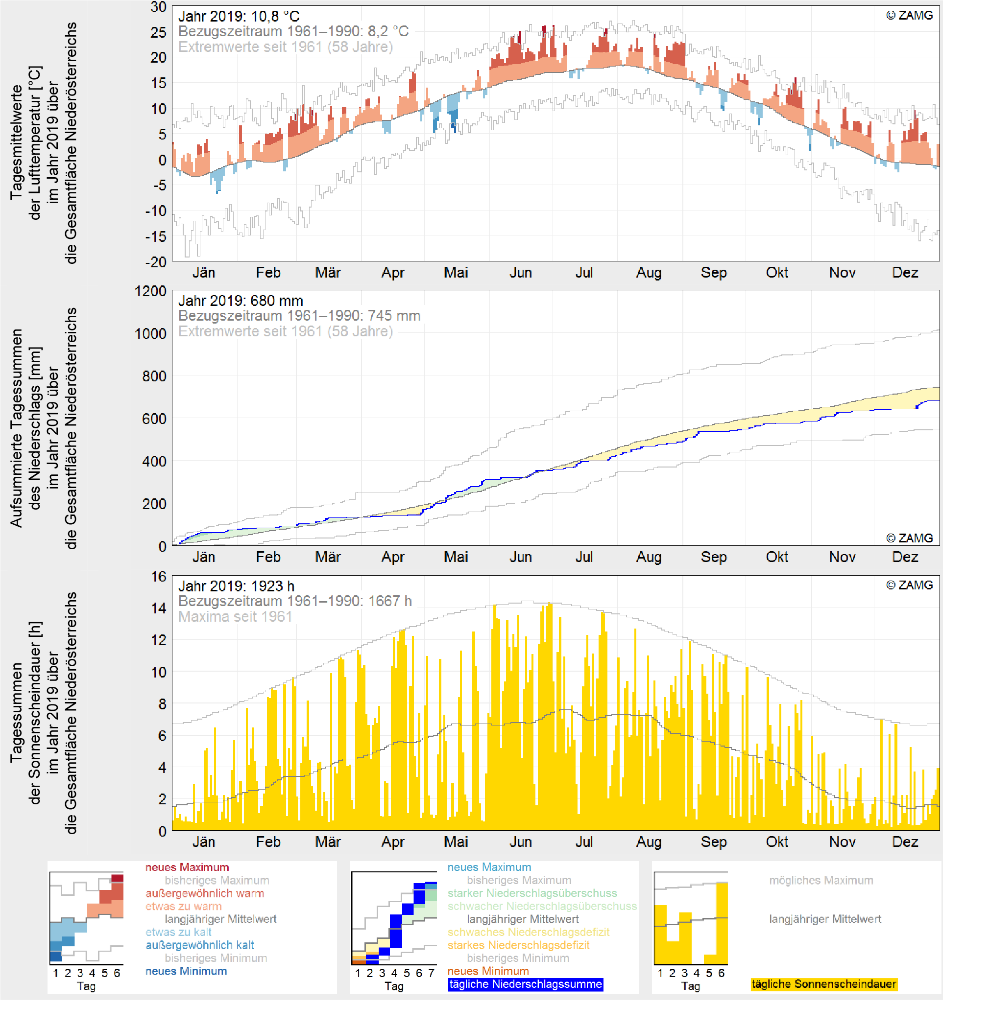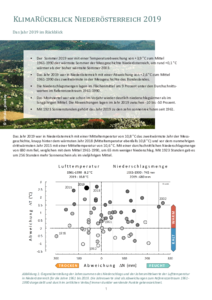 In 2019, Lower Austria recorded a mean temperature of 10.8 °C, making it the second warmest year in the history of measurements, just behind the warmest year 2018 (mean temperature also 10.8 °C) and ahead of what is now the third warmest year, 2015, with a mean temperature of 10.6 °C. With an average precipitation of 680 mm, rainfall was 65 mm below the 1961–1990 mean. At 1,923 hours, sunshine duration was 256 hours above the long-term average.