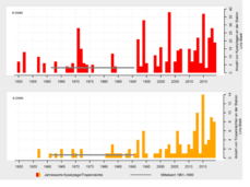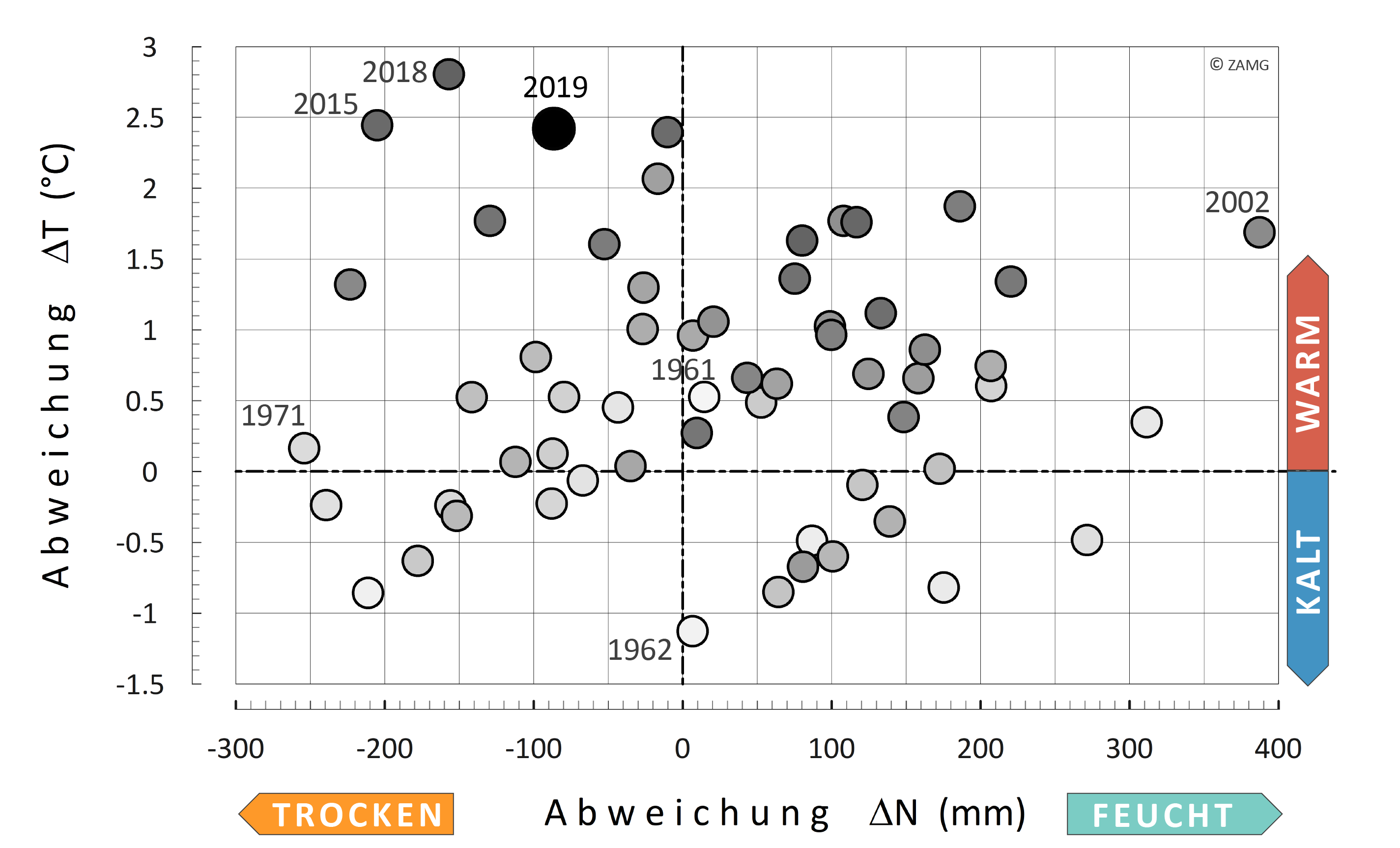 In 2019, Upper Austria recorded a mean temperature of 9.9 °C, making it the third warmest year in meteorological history, behind the warmest year on record in 2018 and just behind the second warmest year in 2015. With an average precipitation of 1008 mm, rainfall was 87 mm below the 1961–1990 mean. At 1807 sunshine hours, there were 223 hours more sunshine than the long-term average...