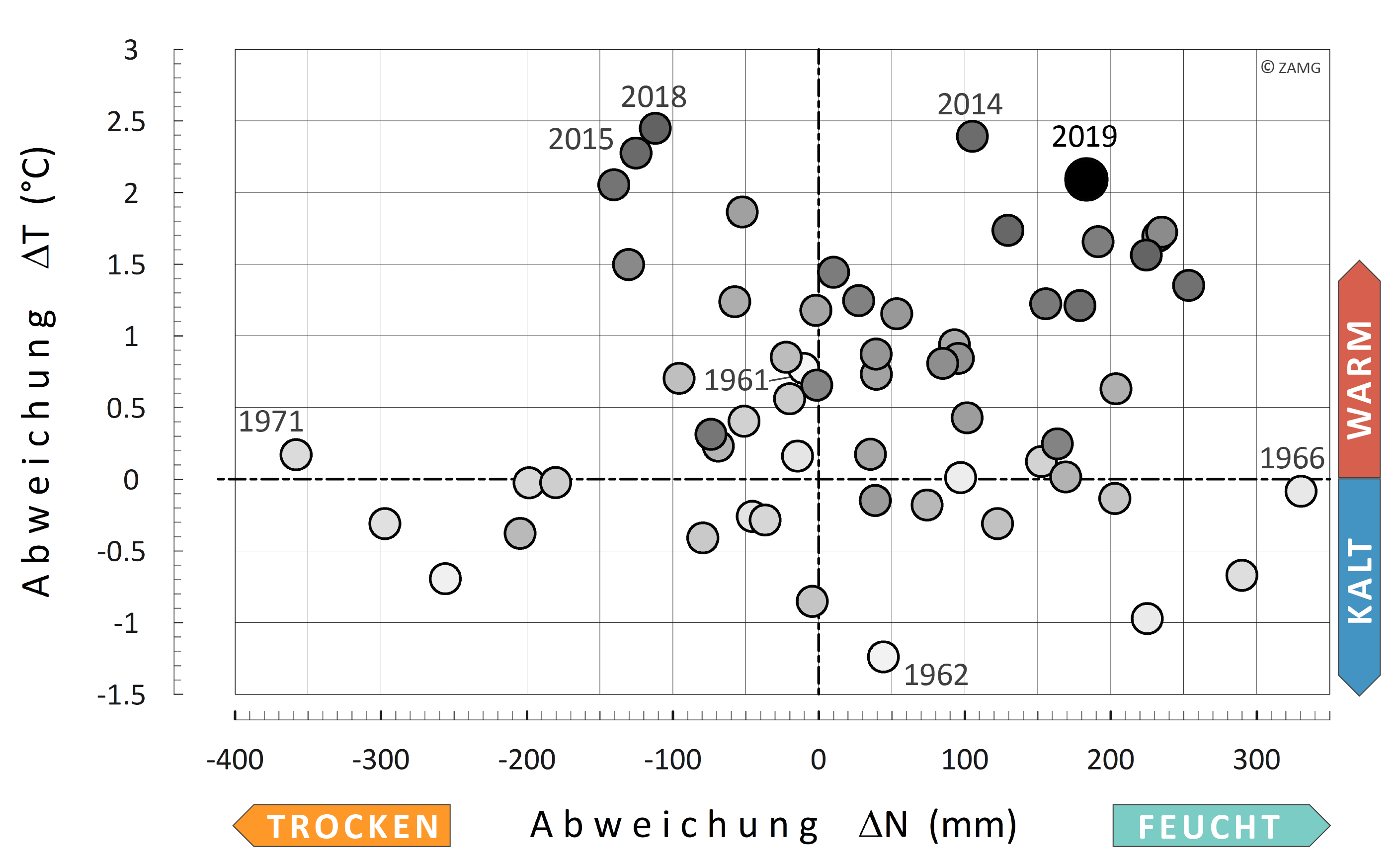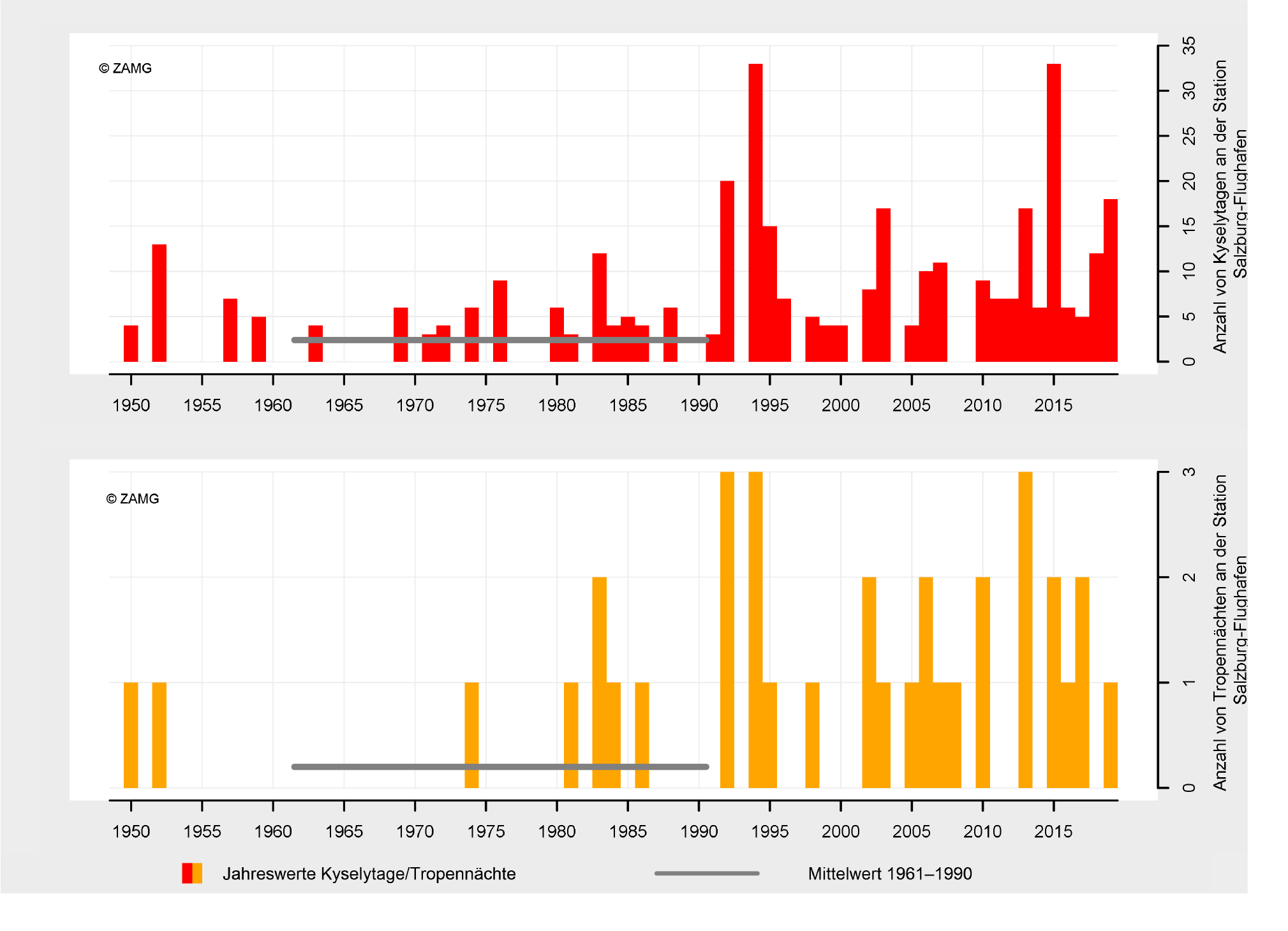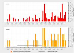 In 2019, Salzburg recorded a mean temperature of 6.2 °C, making it the fourth warmest year in the history of meteorological measurements, behind 2018, 2014 and 2015. With an average precipitation of 1,555 mm, rainfall was 183 mm above the 1961–1990 mean. Despite the above-average precipitation, there were 1,512 hours of sunshine — 88 hours more than the long-term average...