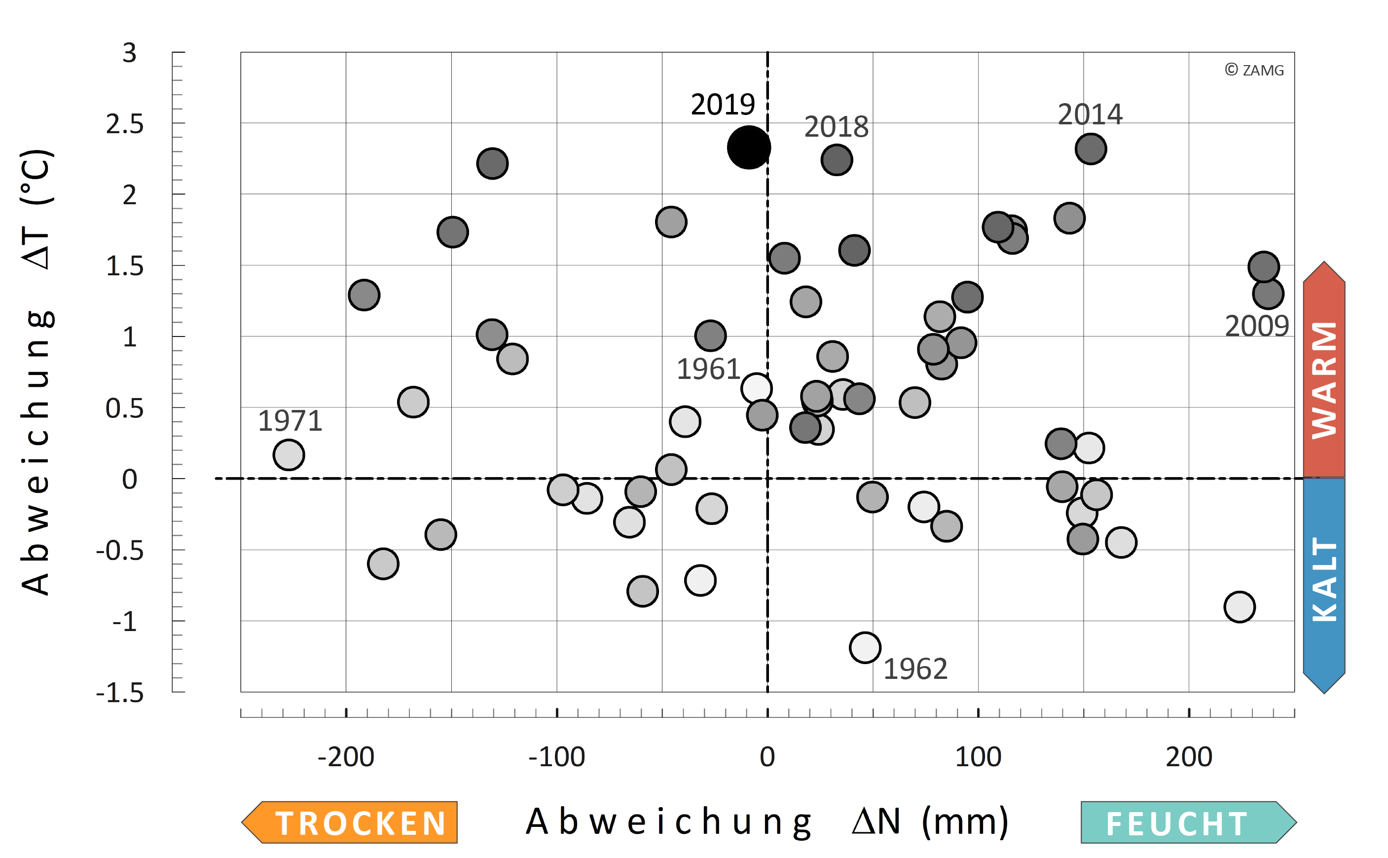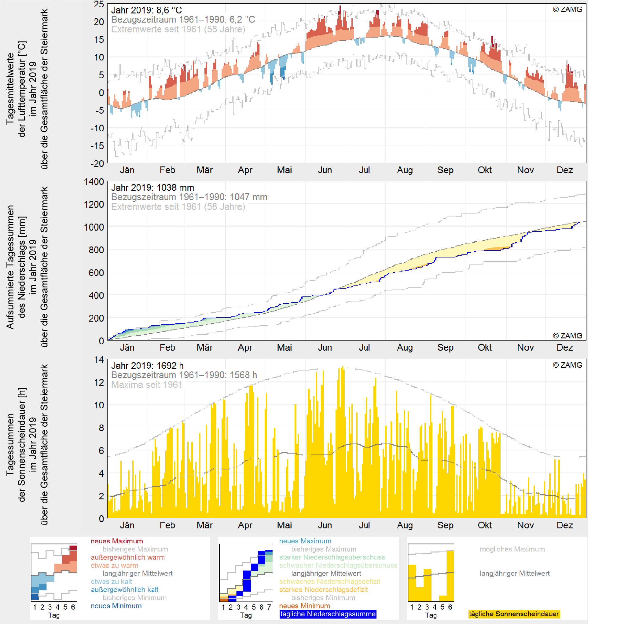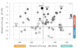 In 2019, Styria recorded a mean temperature of 8.6 °C, making it the warmest year in meteorological history, closely followed by 2014 and 2018. With an average precipitation of 1038 mm, 2019 was roughly in line with the climatological mean for 1961–1990. At 1692 hours, there was 124 hours more direct sunshine than the long-term average...