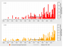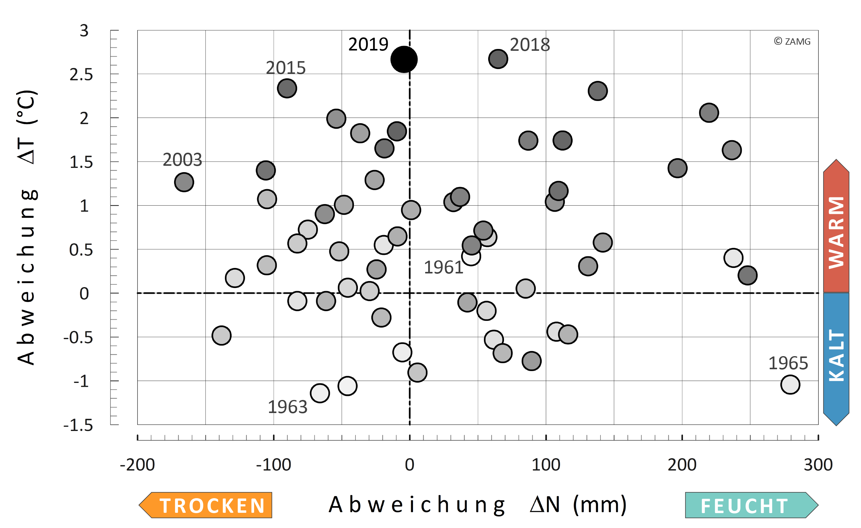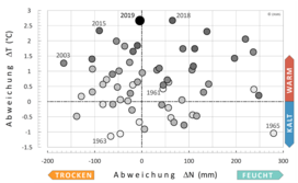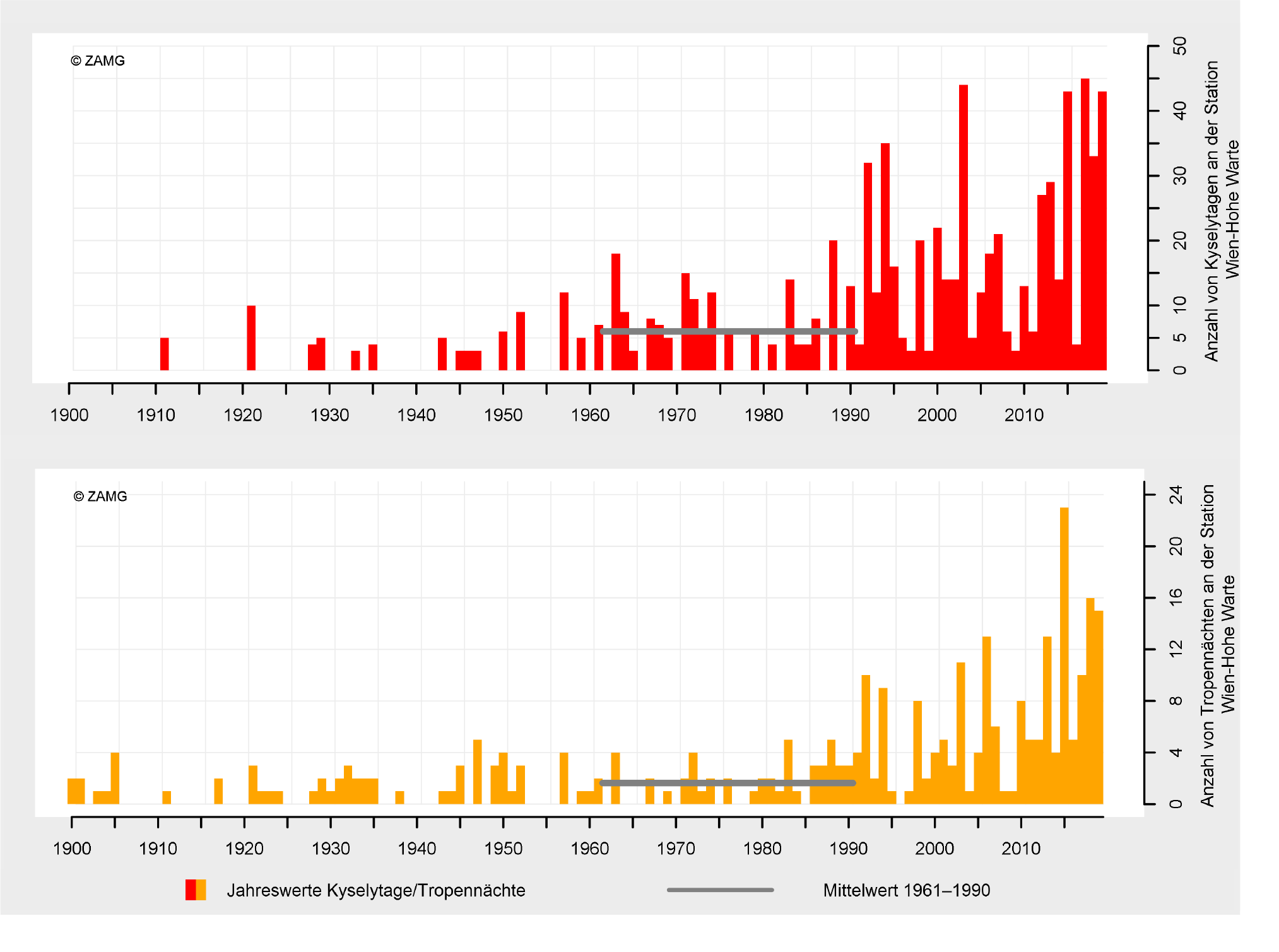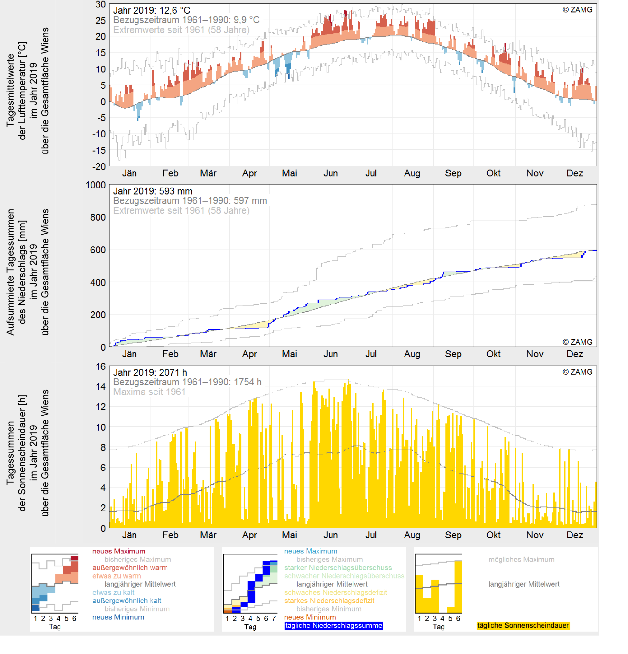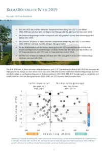 In 2019, Vienna recorded a mean temperature of 12.6 °C, making it — jointly with 2018 — the warmest year in meteorological history, just ahead of 2015 and 2014. With an average precipitation of 593 mm, rainfall was roughly on par with the reference period 1961–1990. At 2,071 hours, sunshine duration exceeded the mean of the reference period 1961–1990 by 317 hours...