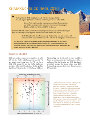 Tyrol recorded its fifth warmest year in meteorological history in 2020. The year was 2.1 °C above Tyrol's mean temperature for 1961–1990. January, April and November brought exceptionally high temperatures and rank among the 3 warmest months of their kind since records began. The same applies to winter 2019/20 as a whole. These three months were also extraordinarily sunny. The second sunniest April since records began was at the same time the sunniest month of the year...