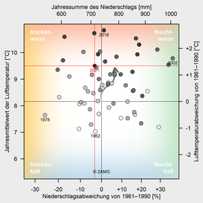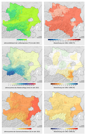 Although 2021 didn't quite reach the extremely high mean temperatures of previous years, it was still far too warm, with a deviation of +1.3 °C. Dry conditions from February to April, in June and in autumn were largely offset by heavy rainfall in July and August. 2021 continued the run of very sunny years, with a surplus of 13 % in sunshine hours. As a result of a prolonged heatwave, June was the third warmest and third sunniest since records began. Over the course of the entire summer, St. Pölten recorded six tropical nights — the second highest figure in 79 years. On 24 June, severe thunderstorms with large hail swept across the north of Lower Austria. In mid-July, unusually intense rainfall hit the Mostviertel region in particular...