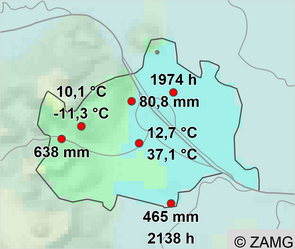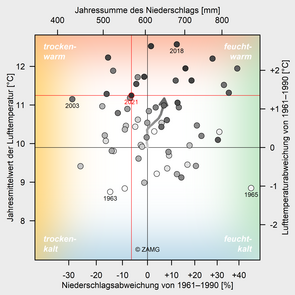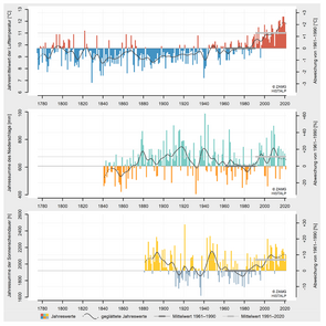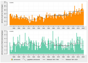 Although 2021 didn't reach the extremely high mean temperature values of previous years, it was still far too warm, with an anomaly of +1.3 °C. Low-precipitation conditions from February to April, in June and in autumn were largely offset by heavy rainfall in July and August. 2021 continued the series of very sunny years. The surplus in sunshine hours amounted to 16%. As a result of a prolonged heatwave, June was the fourth warmest, second driest and second sunniest since records began. Over the summer as a whole, 32 days were part of a heat period, compared to the usual six. On the evening of 17 June, a powerful thunderstorm swept across Vienna with locally extreme rainfall in a short space of time, resulting in flooding and power outages...