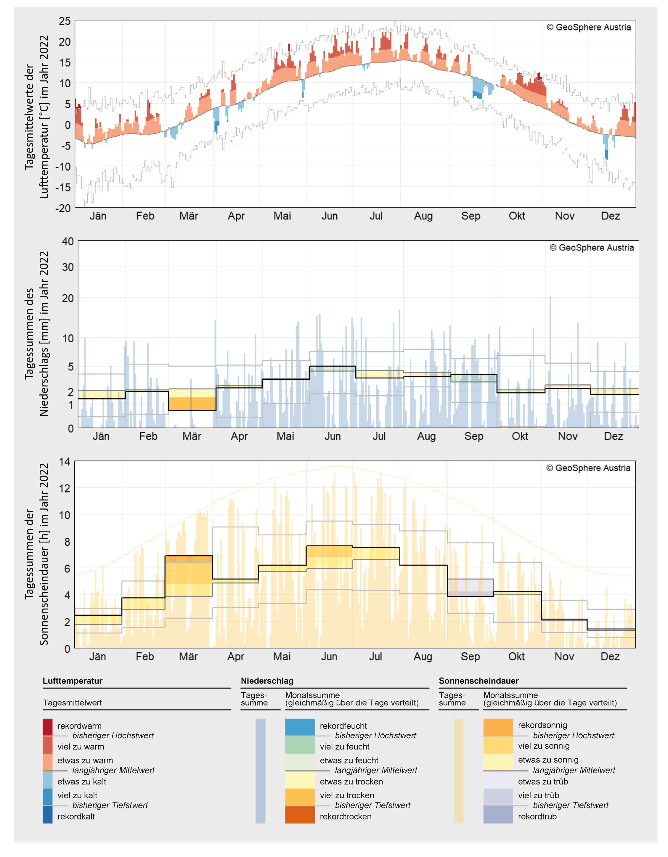 The annually published Climate Status Report Austria is produced on behalf of the Climate and Energy Fund as well as all nine federal provinces by the Climate Change Centre Austria (CCCA) in collaboration with GeoSphere Austria (GSA) and the University of Natural Resources and Life Sciences (BOKU), with the involvement of numerous other research institutions.