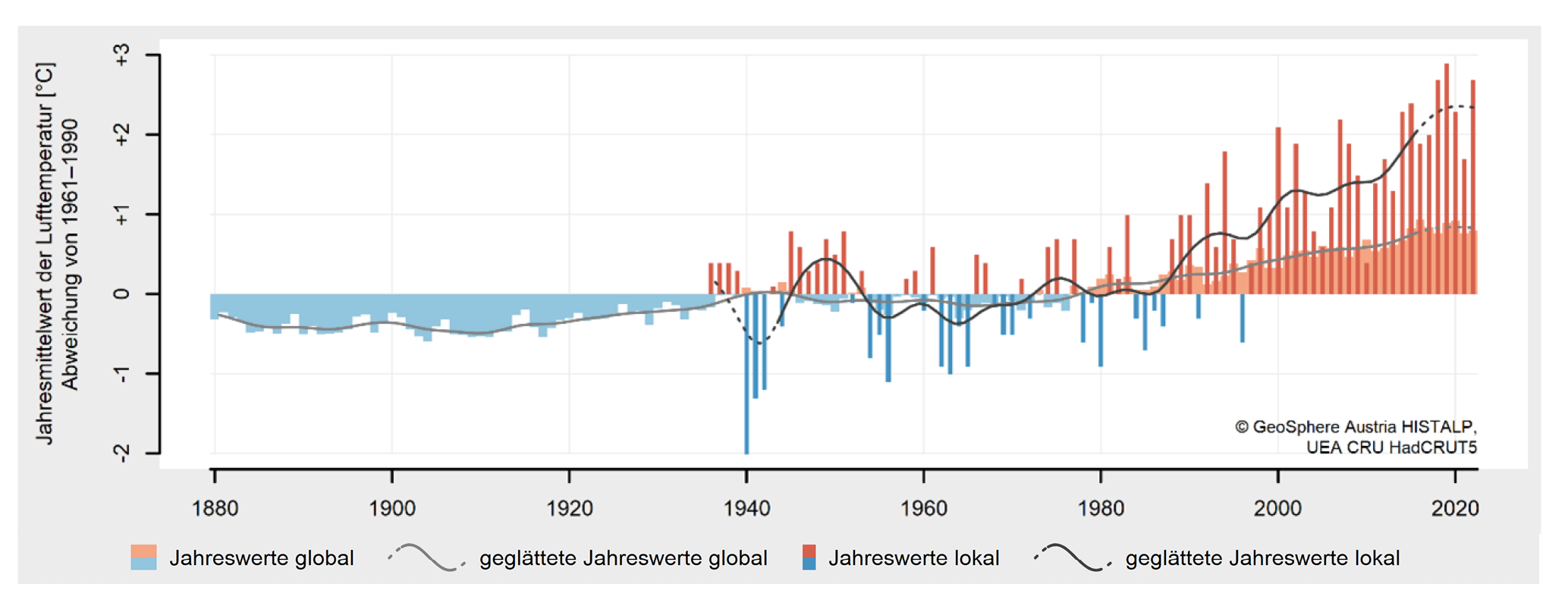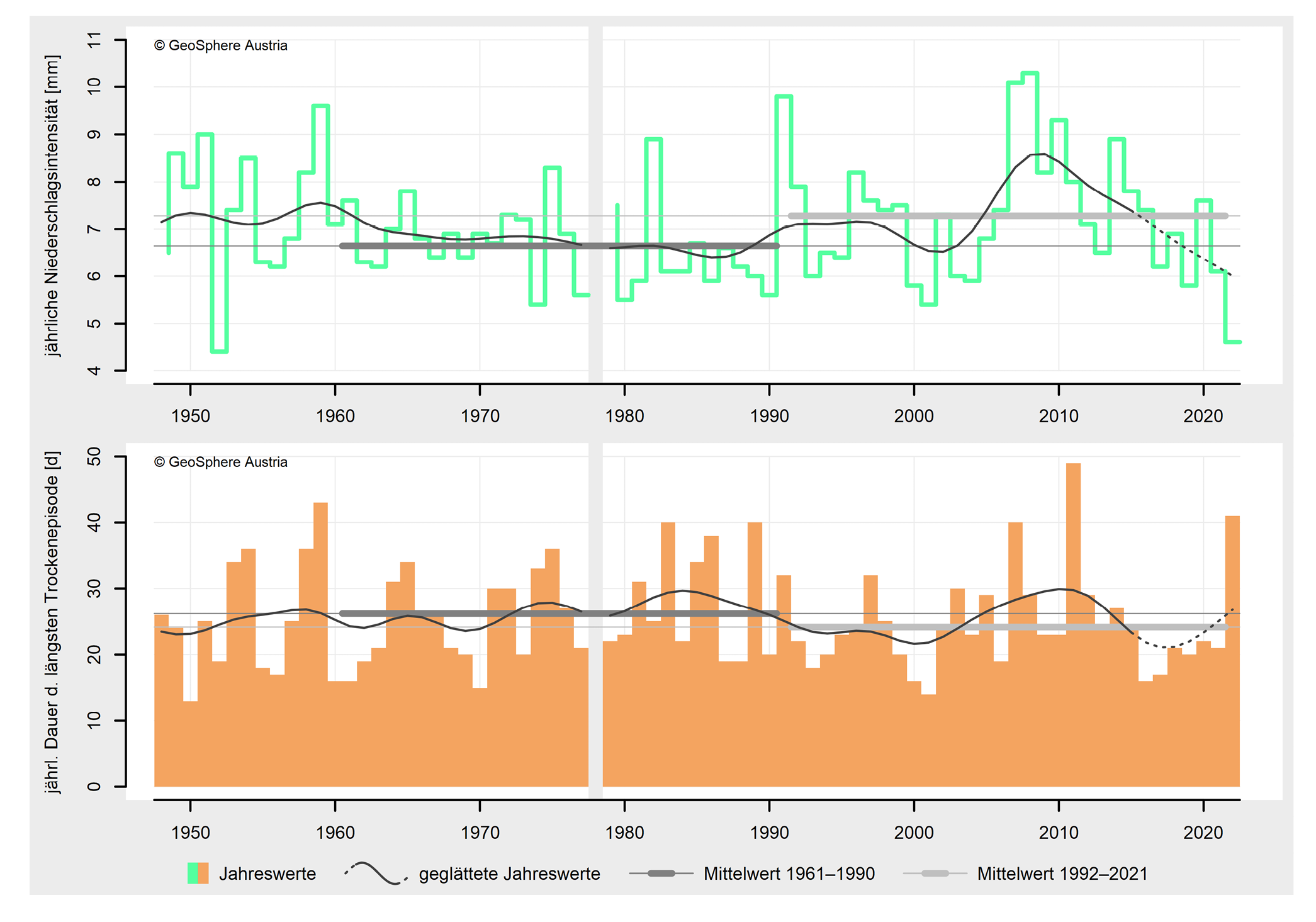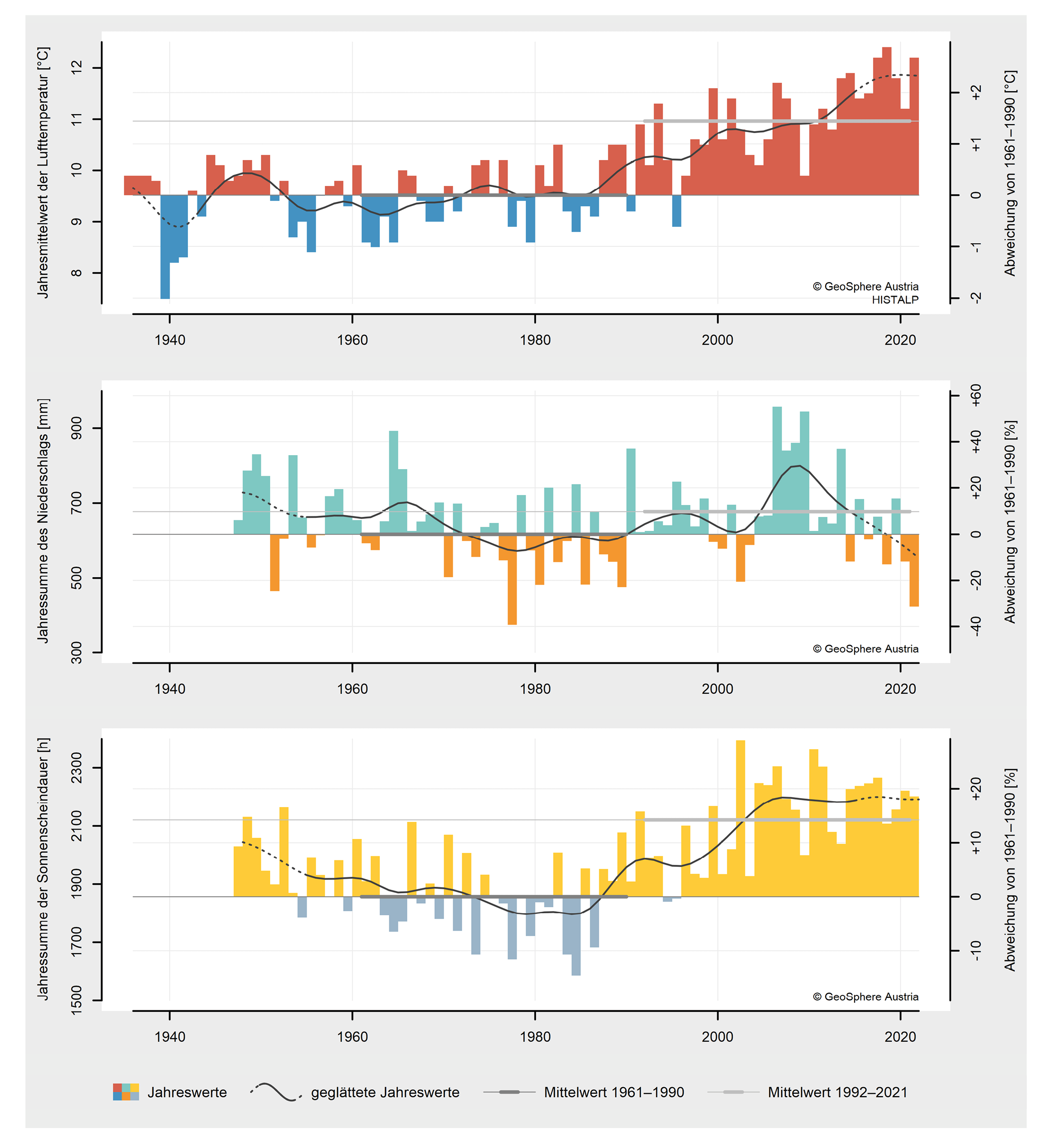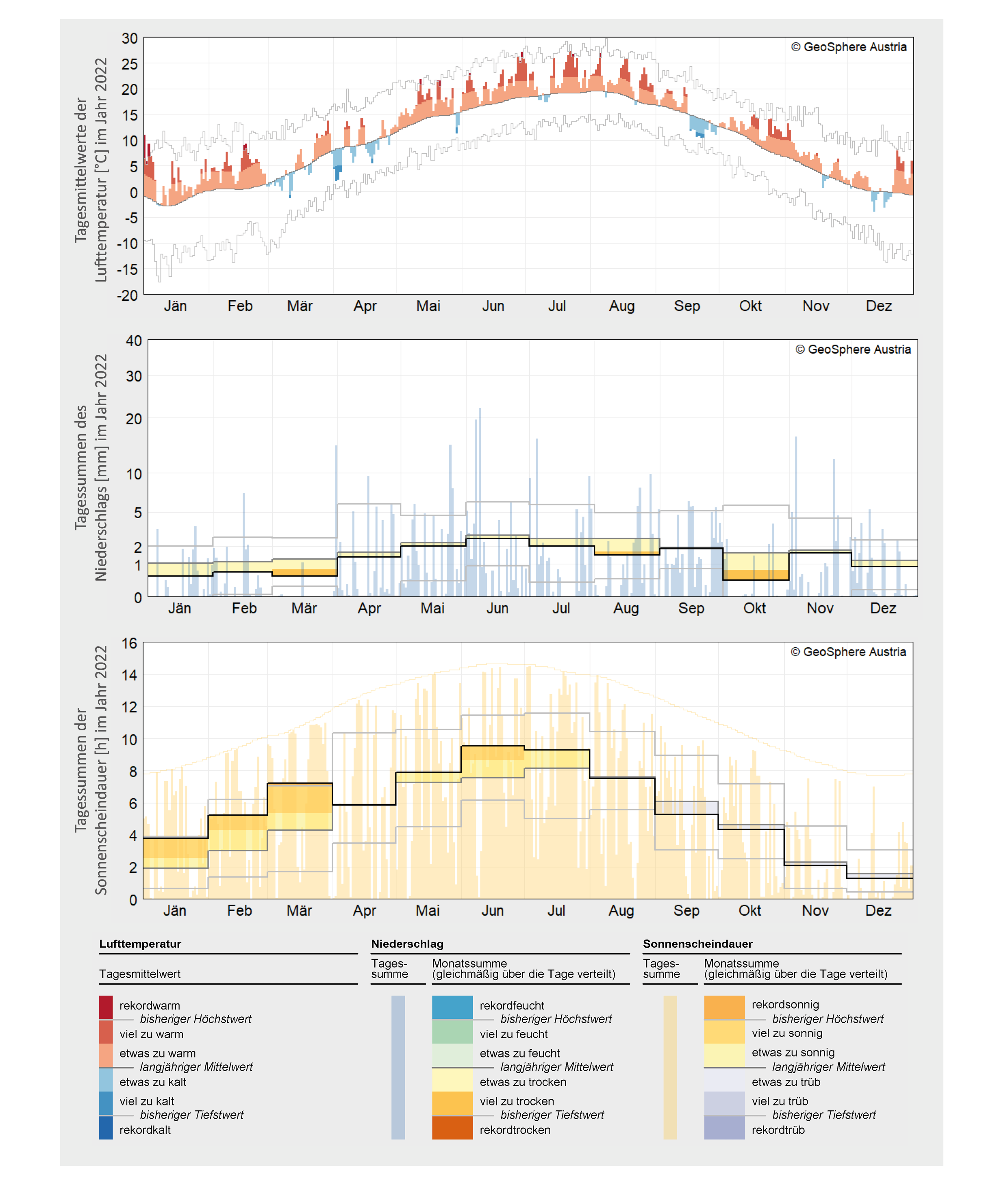 On average across Burgenland, 2022 was the third warmest year since records began, behind 2019 and 2018, and in some higher-lying areas even the warmest on record. The winter of 2021/22 was the third warmest in recorded history, behind 2006/07 and 2019/20. May, June and October ranked as the fourth warmest months in their respective comparison series. The exceptional warmth coincided with a significant precipitation deficit, resulting in pronounced drought conditions. In Eisenstadt, 2022 was the second driest year since 1948. On top of that, sunshine broke records: both the winter of 2021/22 and the following March brought more sunshine hours than at any point since at least 1961. Heatwaves in Eisenstadt lasted longer only in 2019, and the longest dry spell was only exceeded in 2011 and 1959…