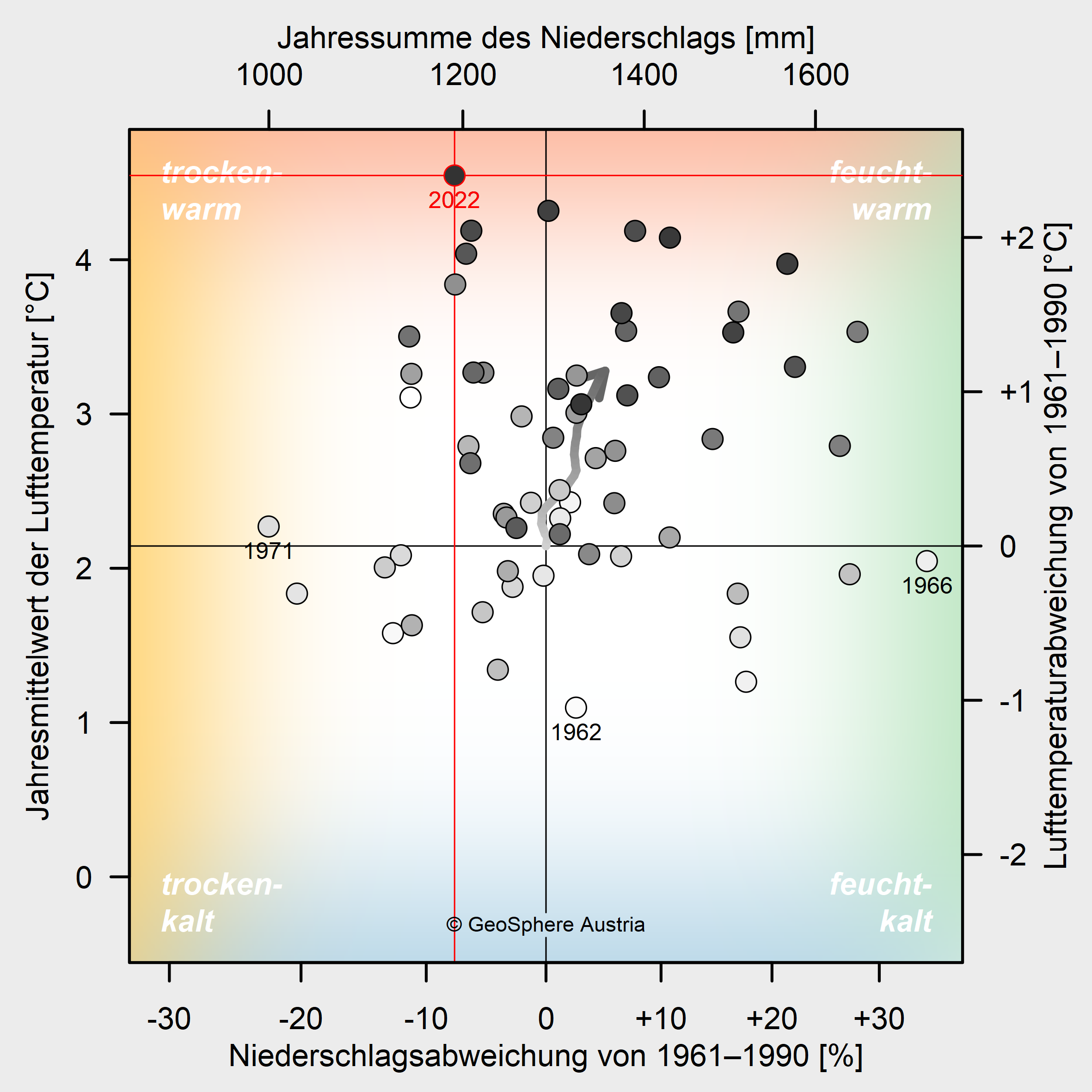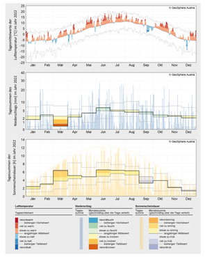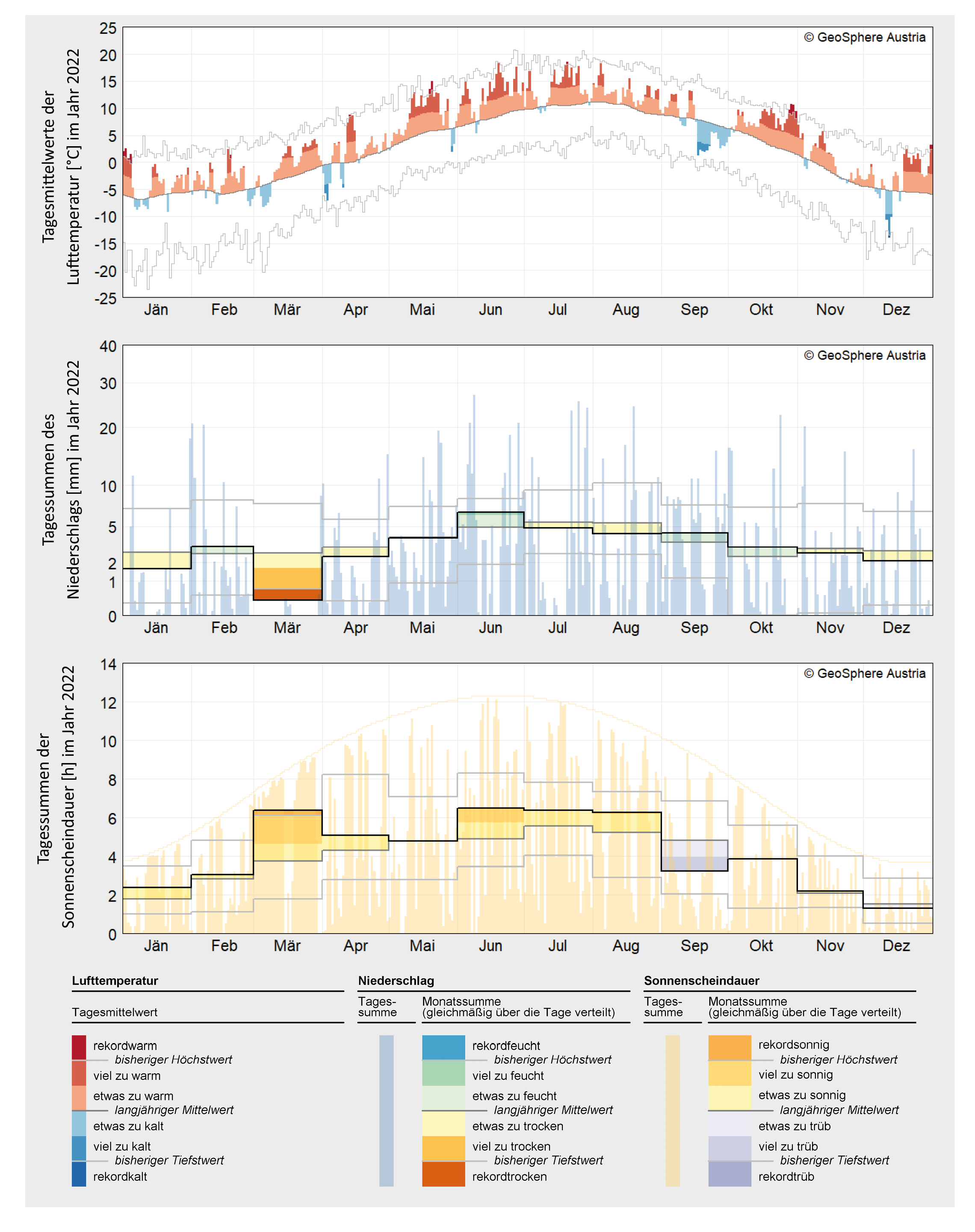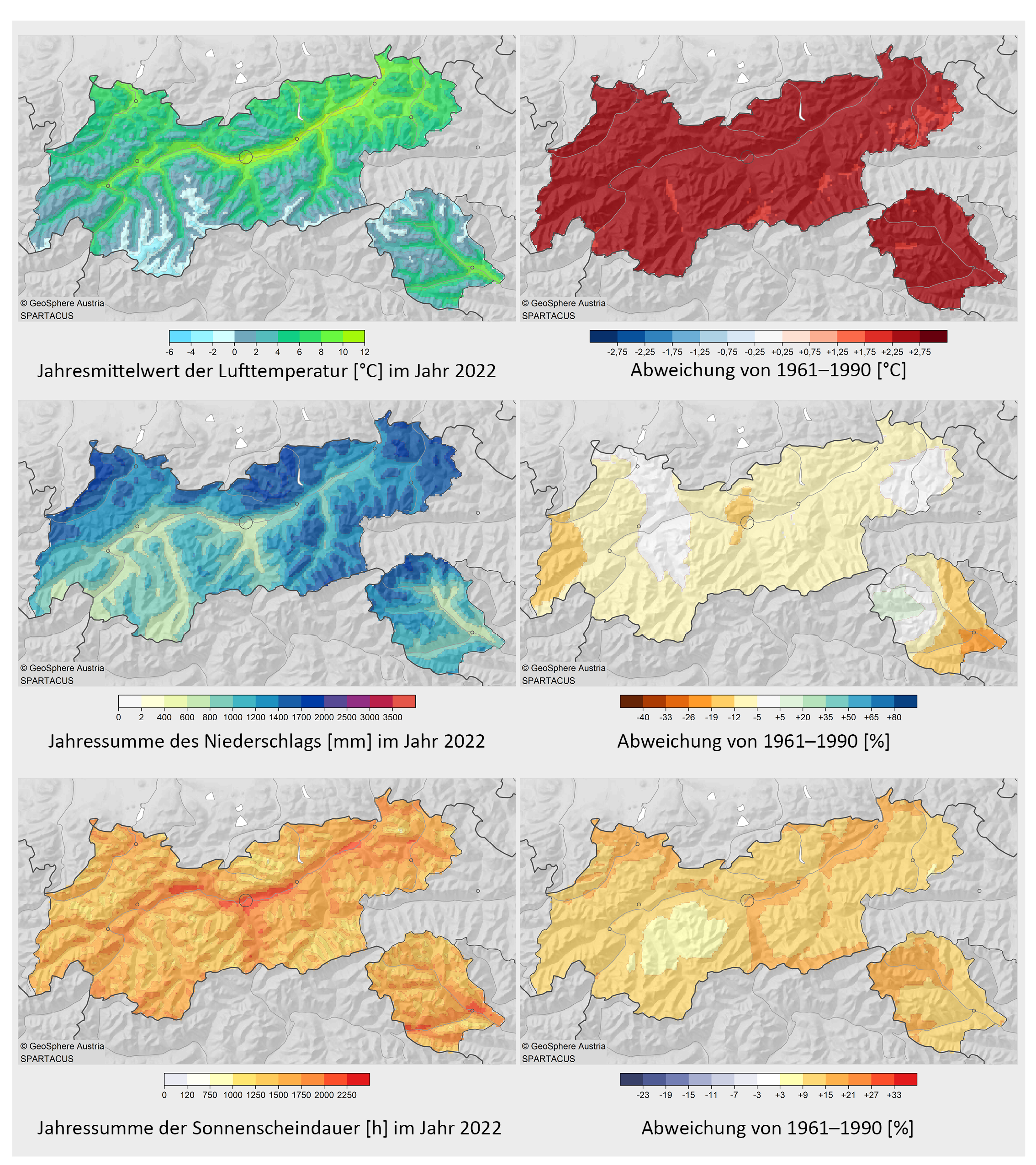 2022 clearly broke the still recent temperature record from 2018: it was, on average across the federal state of Tyrol, the warmest year since records began. October ranked as the warmest, and May as the second warmest month in their respective comparison series. Summer was the third warmest on record, behind 2003 and 2019. March stood out as the driest and simultaneously the sunniest March month since at least 1961. Despite a cloudy September, 2022 ranks third among the sunniest years in Tyrol since 1961. In Innsbruck, the 25-degree mark was exceeded on 98 days. Only 2018 and 2003 recorded more summer days than 2022…