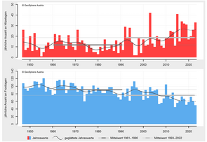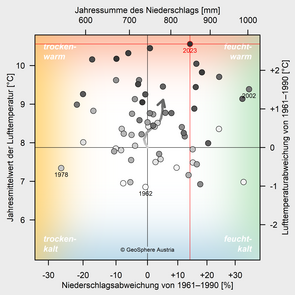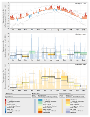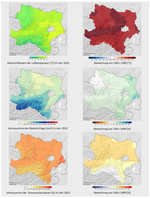 The year 2023 was the warmest year in Lower Austria since records began. Five months ranked in the top 5, with September and October each being the warmest on record, making meteorological autumn 2023 as a whole the warmest on record as well. With an average annual total of 848 mm, precipitation was significantly above average after two relatively dry years. April, November, and December brought very large amounts of precipitation. December 2023 reached an average monthly total of 105 mm, the highest value since at least 1961. A notable late frost event in early April caused significant damage to already well-advanced vegetation in fruit growing…