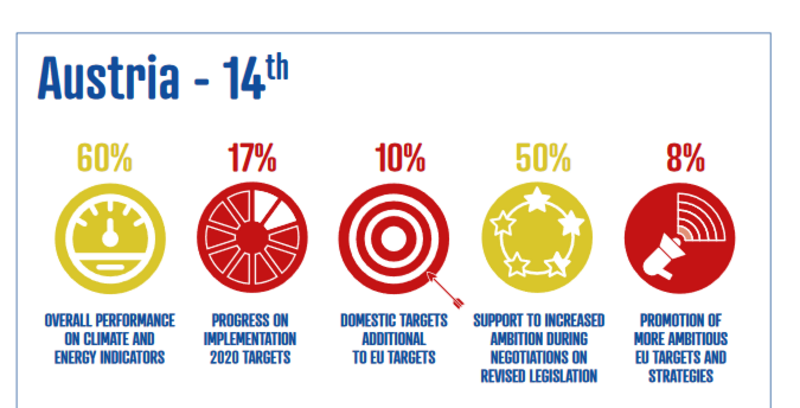 Der Bericht kommt zu dem Schluss, dass die 28 EU-Länder zu wenig unternehmen, um die Ziele des Pariser Klimaschutzabkommens zu erreichen. Österreich, von der Allianz für Klimagerechtigkeit (AfK) bewertet, muss sich mit dem 14. Platz zufriedengeben.