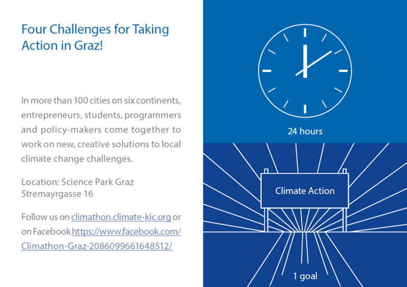 Unter dem Dach von Climate KIC (<link http: www.climate>www.climate –kic.org) organisieren das CCCA, der GreenTech Cluster, der Science Park Graz und die TU Graz gemeinsam den ersten Climathon in Graz.