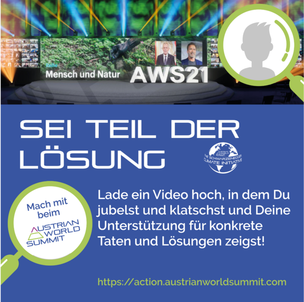 Dann mach mit und lade ein Video (Querformat/15-20 Sek.) hoch, in dem du jubelst, klatscht und deine Unterstützung für konkrete Aktionen und Lösungen zeigst! Die Videos werden auf den LED-Screens beim diesjährigen AUSTRIAN WORLD SUMMIT übertragen und sind während unseres Livestreams und der TV-Übertragung zu sehen!