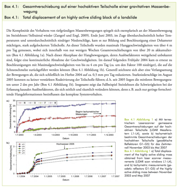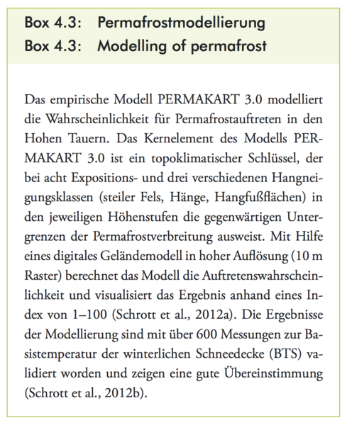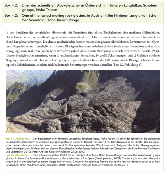 Glade, T., R. Bell, P. Dobesberger, C. Embleton-Hamann, R. Fromm, S. Fuchs, K. Hagen, J. Hübl, G. Lieb, J.C. Otto, F. Perzl, R. Peticzka, C. Prager, C. Samimi, O. Sass, W. Schöner, D. Schröter, L. Schrott, C. Zangerl und A. Zeidler, 2014: Der Einfluss des Klimawandels auf die Reliefsphäre. In: Österreichischer Sachstandsbericht Klimawandel 2014 (AAR14). Austrian Panel on Climate Change (APCC), Verlag der Österreichischen Akademie der Wissenschaften, Wien, Österreich, S. 557–600.