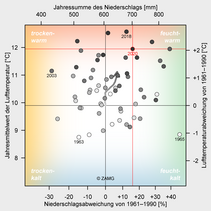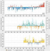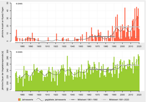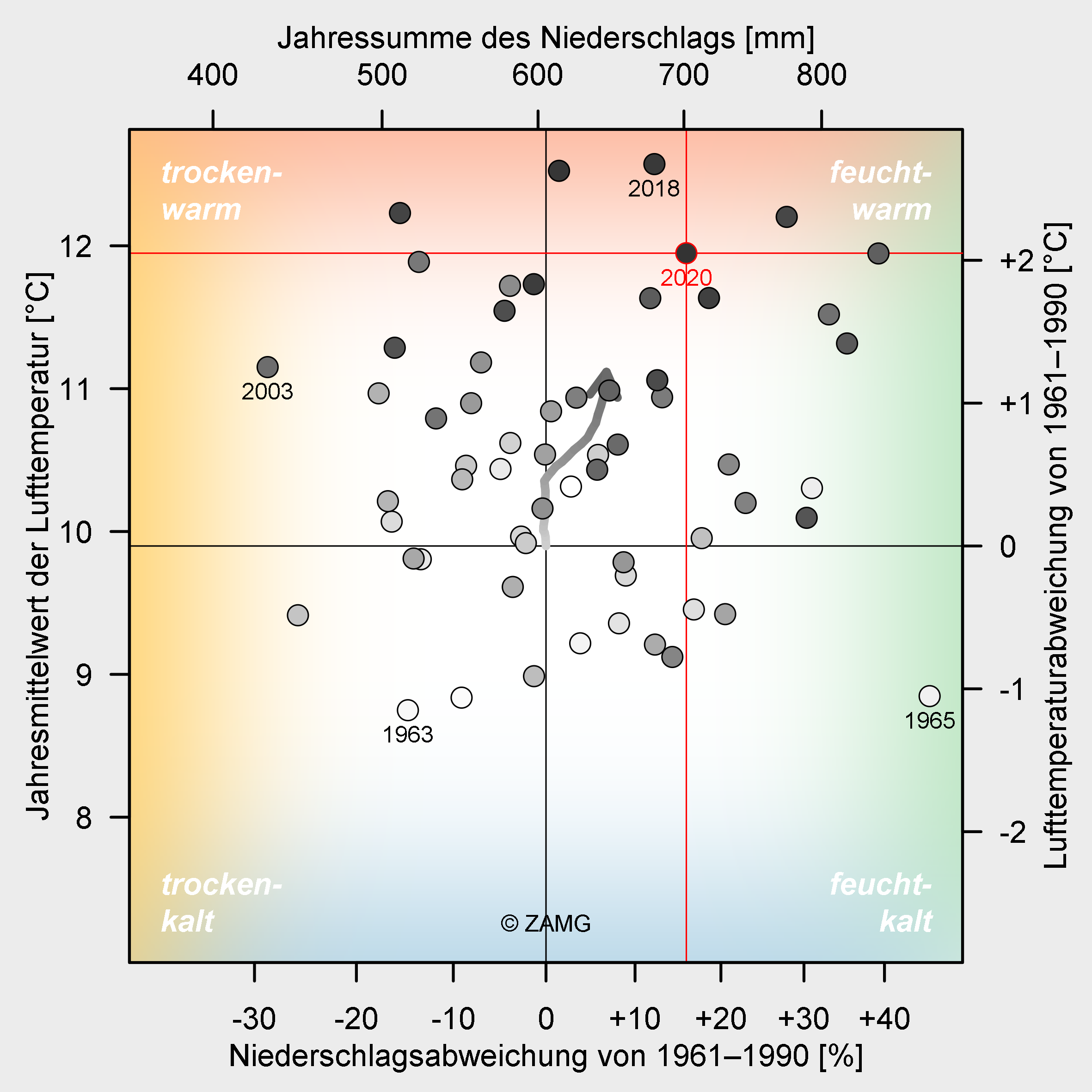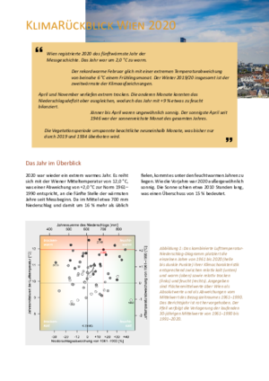 Wien registrierte 2020 das fünftwärmste Jahr der Messgeschichte. Das Jahr war um 2,0 °C zu warm. Der rekordwarme Februar glich mit einer extremen Temperaturabweichung von beinahe 6 °C einem Frühlingsmonat. Der Winter 2019/20 insgesamt ist der zweitwärmste der Klimaaufzeichnungen. April und November verliefen extrem trocken. Die anderen Monate konnten das Niederschlagsdefizit aber ausgleichen, wodurch das Jahr mit +9 % etwas zu feucht bilanziert...