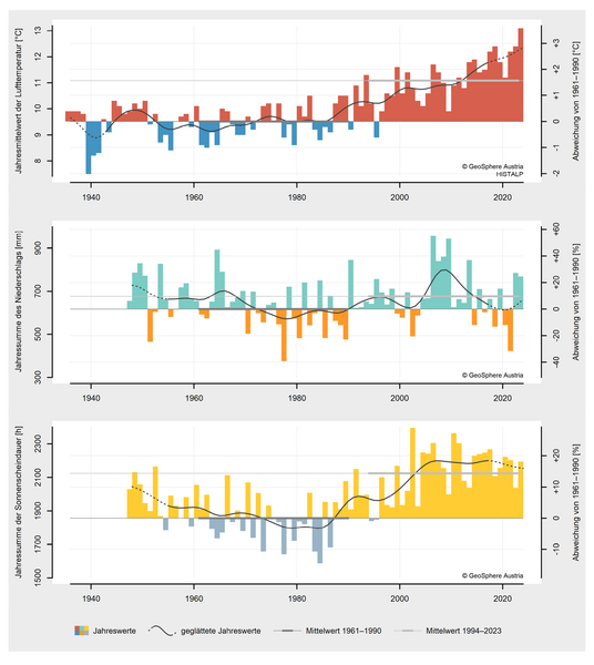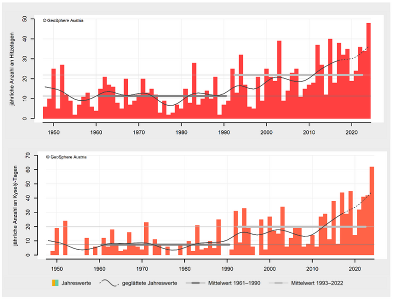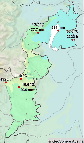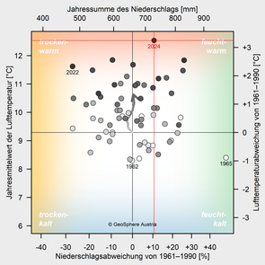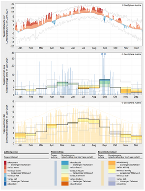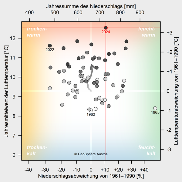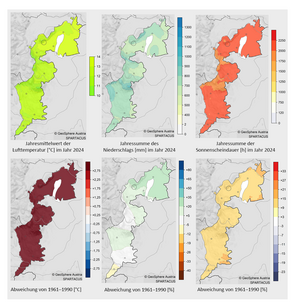 2024 war mit einer mittleren Temperatur von 12,5 °C (Abw. +3,2 °C) mit großem Abstand das wärmste Jahr in Burgenlands Messgeschichte. Beginnend mit dem Winter 2023/2024 gab es im Burgenland drei rekordwarme Jahreszeiten in Folge. Nach der extrem milden Phase von Anfang Februar bis Mitte April und der damit verbundenen weit fortgeschrittenen Pflanzenentwicklung sorgte ein Kaltlufteinbruch in der zweiten Aprilhälfte für große Schäden im Obst- und Weinbau. Von Mitte Juni bis Anfang September bestimmten zwei außergewöhnlich lange Hitzewellen mit in Summe durchschnittlich 56 Kysely-Tagen das Sommerwetter. Im September verursachte das Mittelmeertief „Anett“ durch Sturm und Starkregen große Schäden…