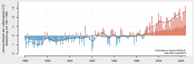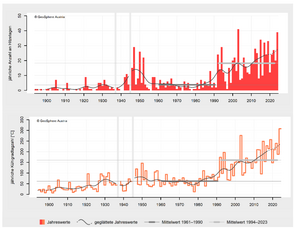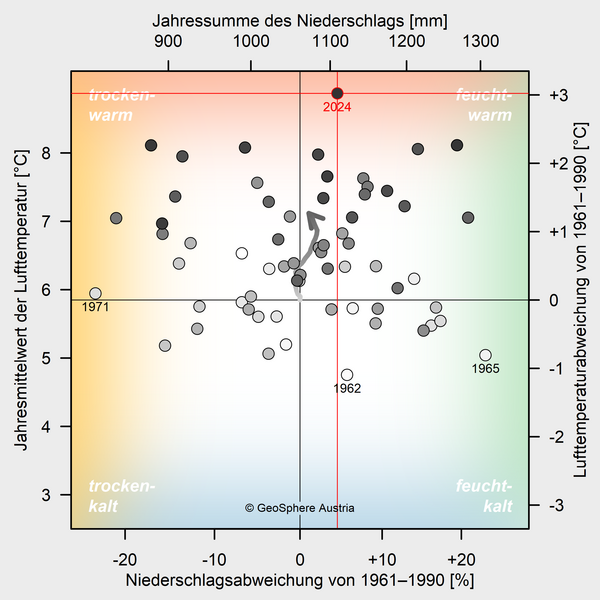 2024 war mit einer mittleren Temperatur von 8,9 °C (Abw. +3,0 °C) mit großem Abstand das wärmste Jahr in der Messgeschichte der Steiermark. Beginnend mit dem Winter 2023/2024 gab es in der Steiermark drei rekordwarme Jahreszeiten in Folge. Nach der extrem milden Phase von Anfang Februar bis Mitte April und der damit verbundenen weit fortgeschrittenen Pflanzenentwicklung sorgte ein Kaltlufteinbruch in der zweiten Aprilhälfte für große Schäden im Obst- und Weinbau. Die sommerliche Hitze sorgte kombiniert mit der relativen Niederschlagsarmut für erhebliche Schäden in der Land- und Forstwirtschaft Im September verursachte das Mittelmeertief „Anett“ durch Sturm und Starkregen große Schäden…